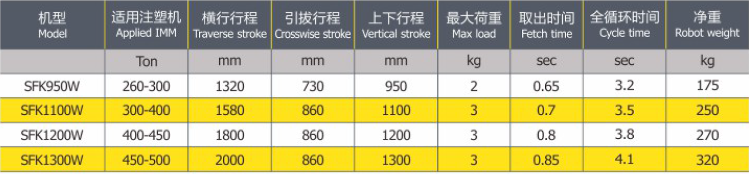 Standard SFK series robot is telescopic type with double stage arm (Optional two axes or three axes servo drive). SFK series robot is high speed type, mainly for some products which production cycle is between 3 to 6 secondszsuch as disposable lunch boxes, knifes and forks thin wall products etc. The fastest cycle time of high speed SFK series robot can reach 2.8s, while the fetch time is 0.6s. As the featured product of Samfacc, high speed SFK series has great advantages in the industry.